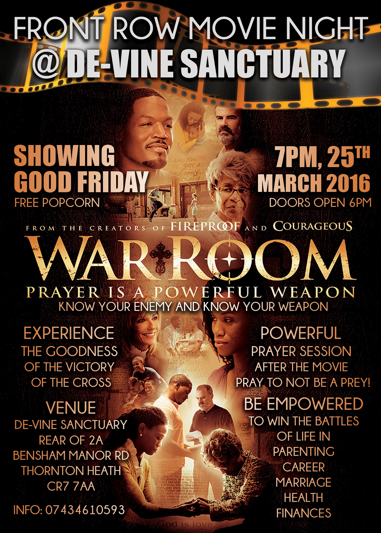 True Vine Centre Harris Invictus Academy, 88 London Road, Croydon, Surrey, United KingdomWAR ROOM - The Movie This Good Friday, come and experience the goodness of the Victory of The Cross at this special screening of the life changing War Room movie. FREE POPCORN will be served. Doors open 6pm for 7pm screening.