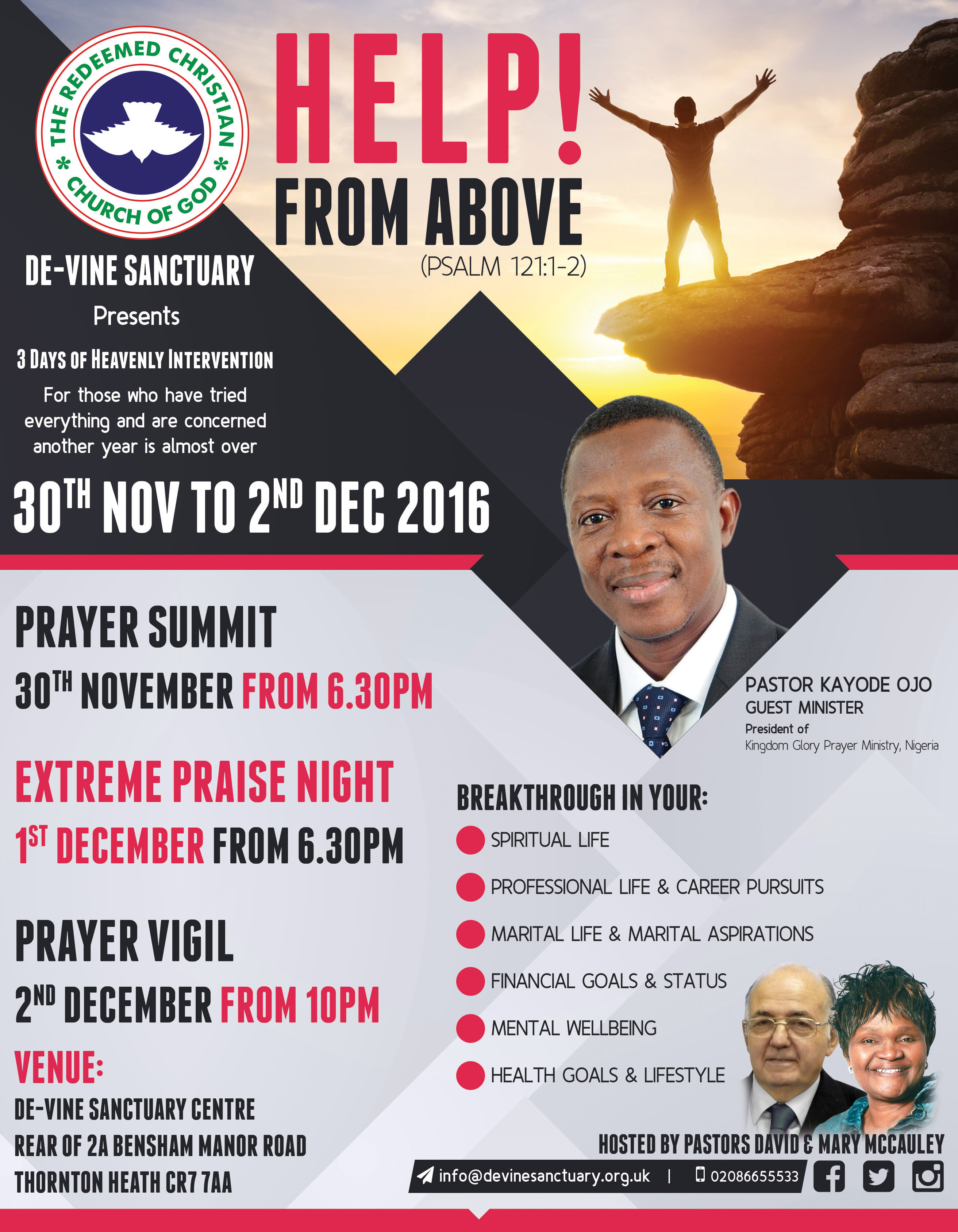 True Vine Centre Harris Invictus Academy, 88 London Road, Croydon, Surrey, United KingdomHELP FROM ABOVE (PSALM 121:1-2) 3 Days of Heavenly Intervention for those who have tried everything and are concerned another year is almost over