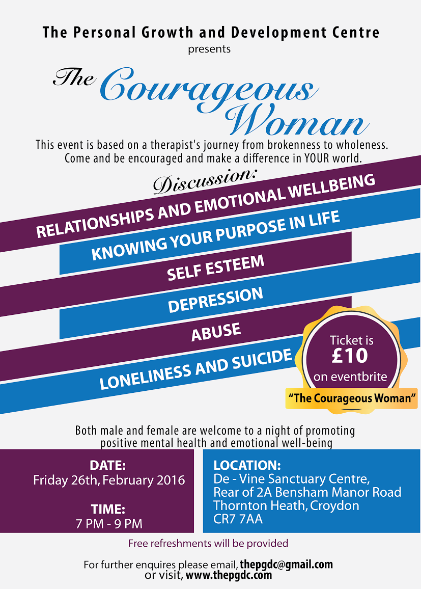 True Vine Centre Harris Invictus Academy, 88 London Road, Croydon, Surrey, United KingdomThis event is based on a therapist’s journey from brokenness to wholeness. Come and be encouraged to make a difference in YOUR world (both male and female are welcome).