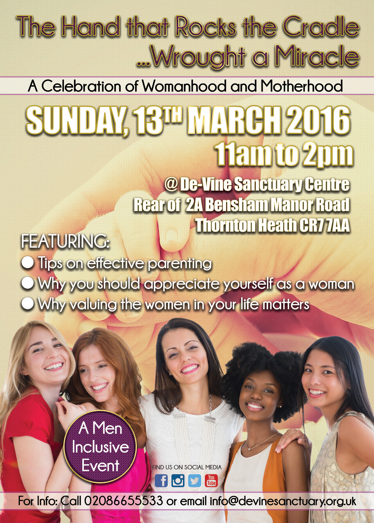 True Vine Centre Harris Invictus Academy, 88 London Road, Croydon, Surrey, United KingdomJoin us as we celebrate Womanhood and Motherhood with a morning/afternoon of uplifting Music, Messages and 3 Course Celebration Lunch. This is a Men inclusive event.